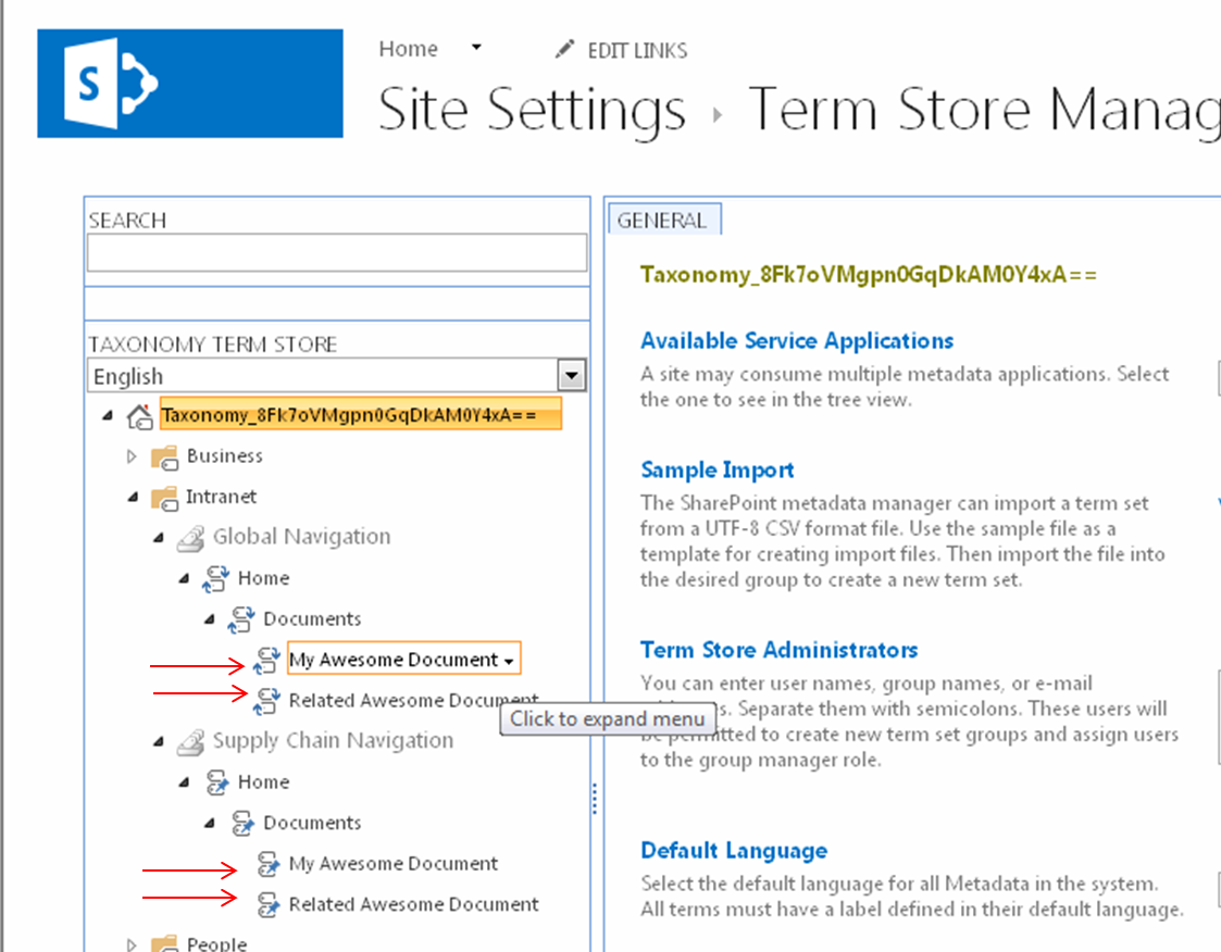 - Click on a Term Group that you are using for your global navigation (my example in the screen shots below is called “Intranet”)