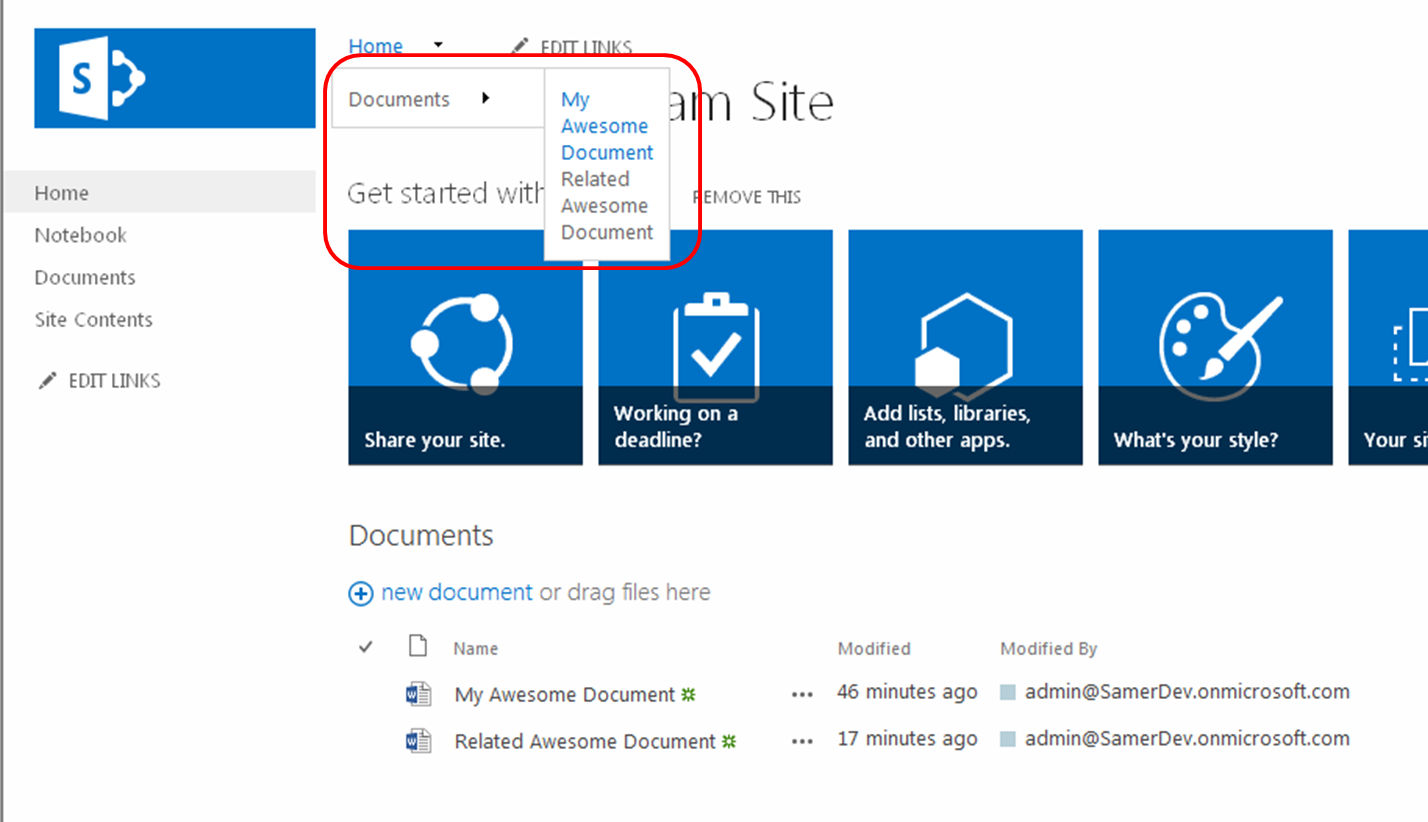 - For my example, I now opened the Document library and added the “My Awesome Document” under the Documents navigation item